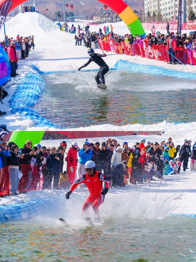而“猛龙过江”则尽显勇者风范:雪场一侧凝雪成峰,与之相对的雪道中央,特意开辟出一处水池。各路滑雪爱好者化身雪地勇者,脚踩雪板从雪峰之上从容滑下,借冰雪之势顺势驰骋,轻盈掠过水面,身姿矫健如猛龙逐浪。大家在腾空与滑行间挑战自我、突破边界,用无畏与热爱诠释冰雪运动的热血与力量,成为雪季尾声里最具冲击力的动感景致。